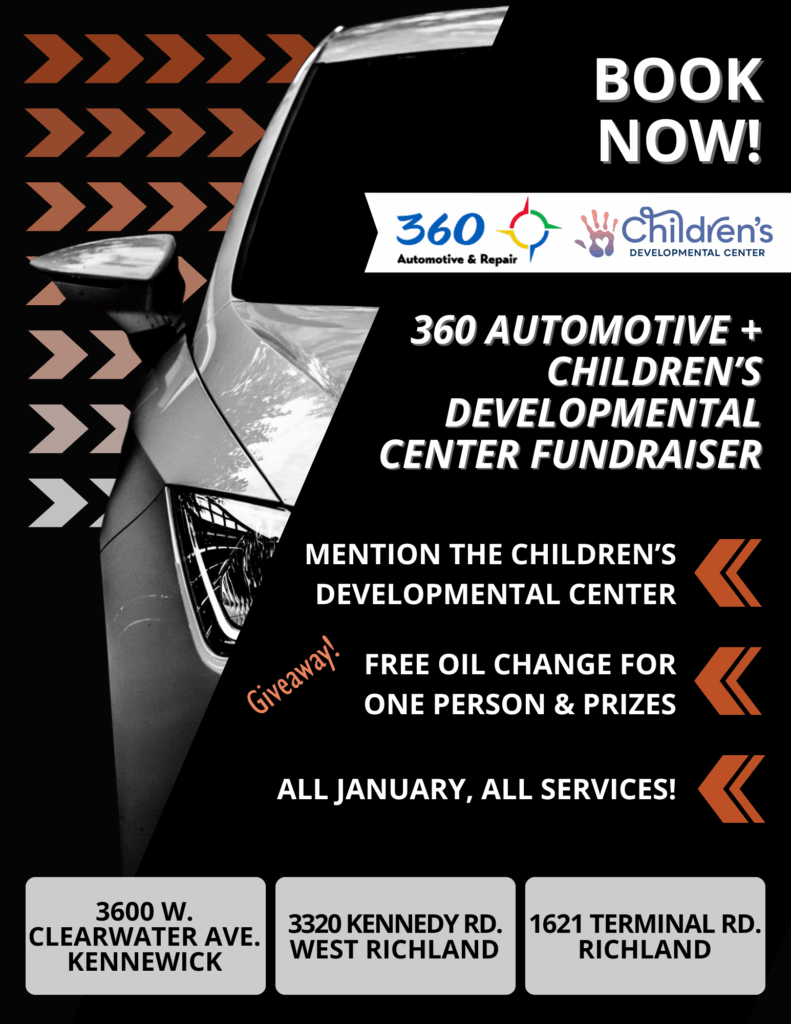 Do you have auto needs coming up as the weather gets colder in the Tri-Cities? Throughout the month of January, mention the Children’s Developmental Center and a percentage of sales from all services at 360 Automotive & Repair will be donated to the Center. We’re collaborating for “Drive for Development!”